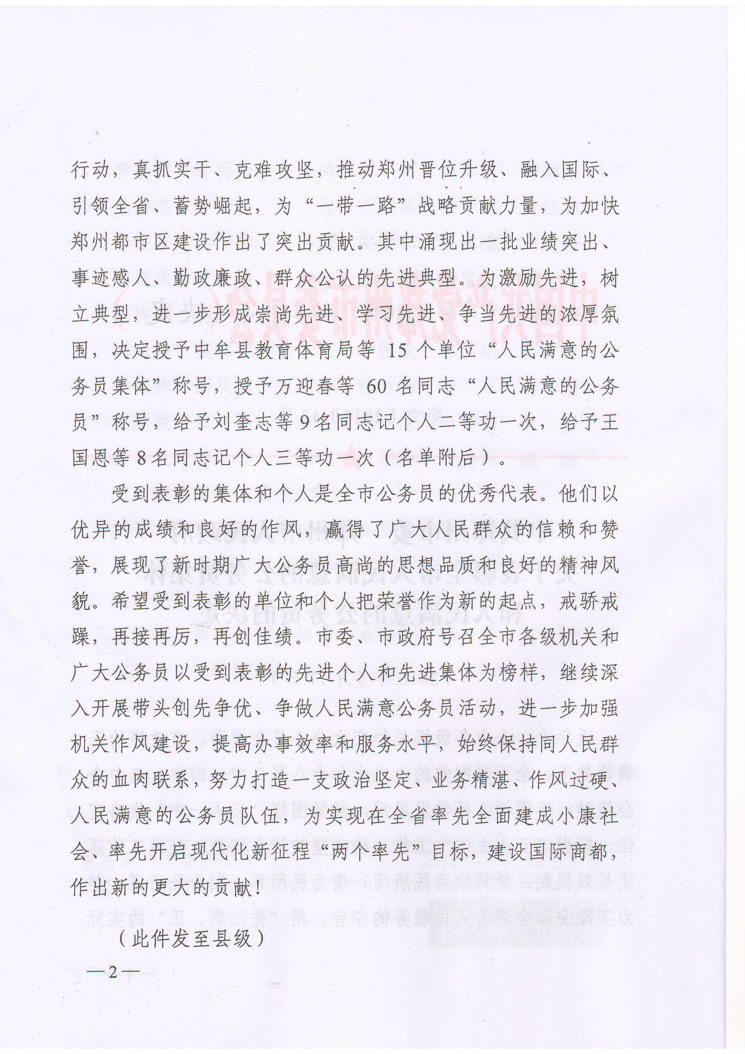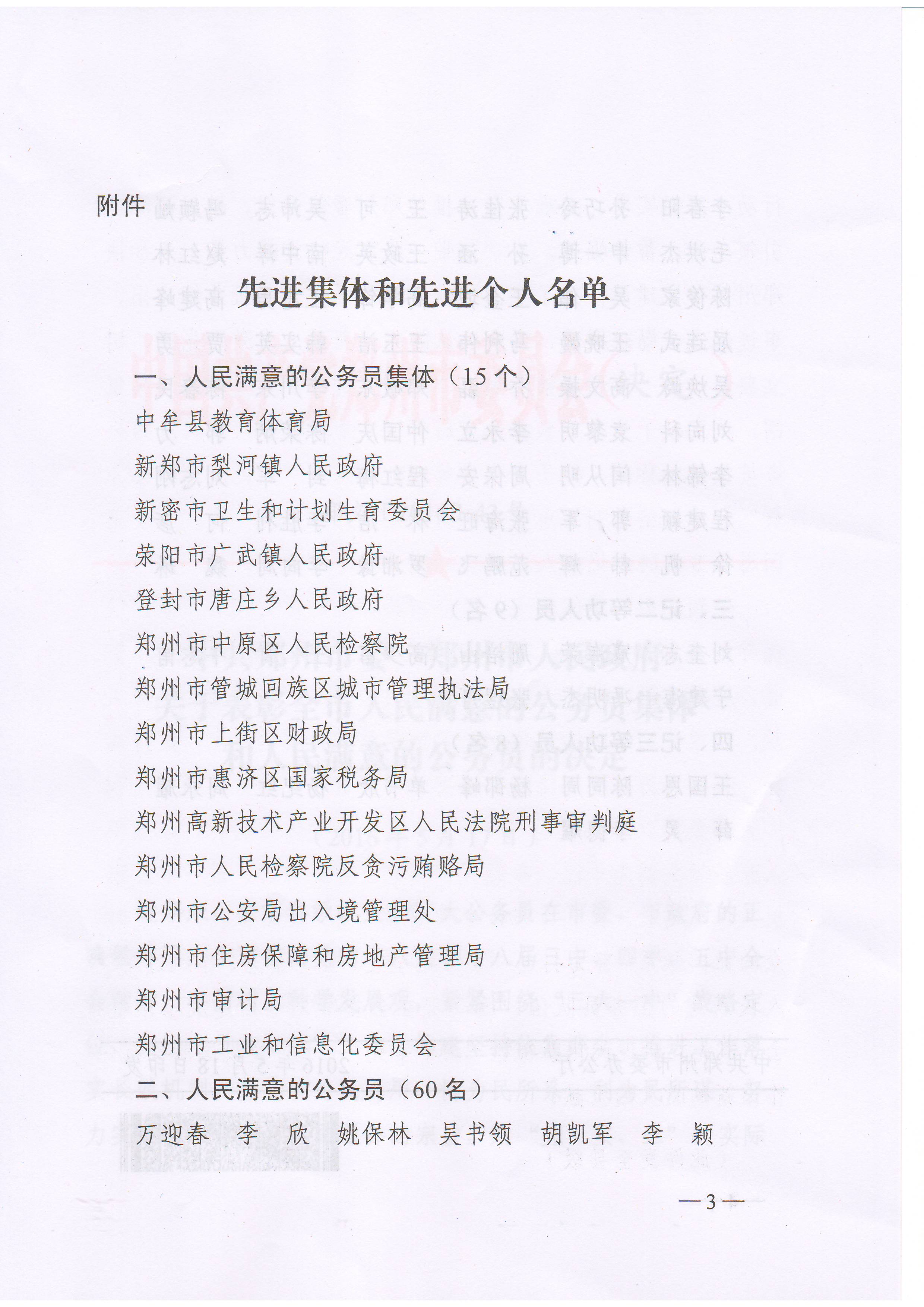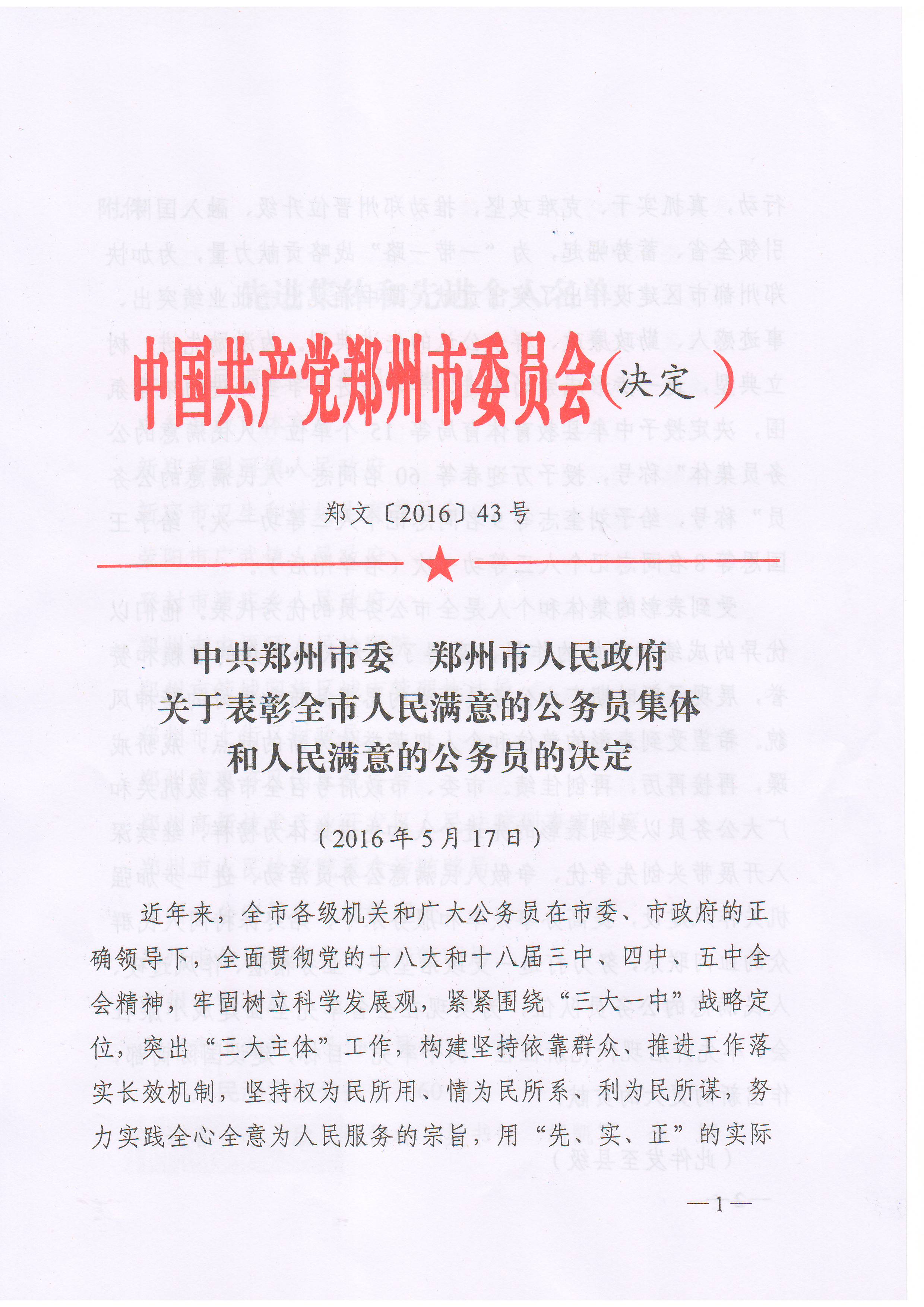 中共郑州市委 郑州市人民政府关于表彰全市人民满意的公务员集体和人民满意的公务员的决定(第四届)